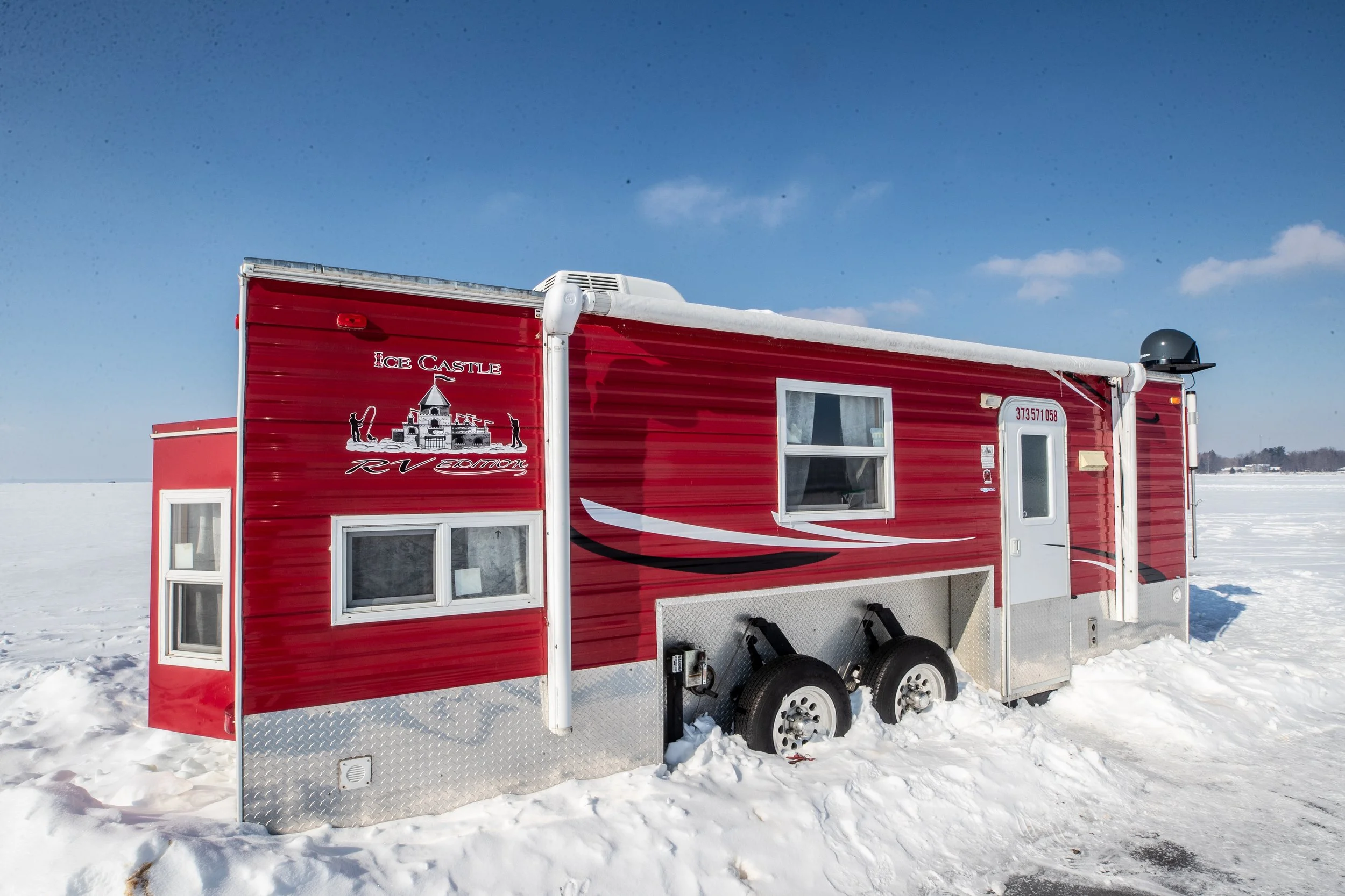 Our 21′ Ice Castles are the most luxurious option for a stay out on the ice. The Ice Castles are equipped with four bunks (one is a double) and have 8 holes with 6 rattle reels. The wheelhouse has a refrigerator, microwave, stove with an oven and an internet connected television. A pizza pan, pot and skillet are provided along with a pizza cutter, spatula and serving spoon. The house includes an onboard bathroom, but though these are RV edition houses, the water is not on during the winter. A generator is included along with extra premium gasoline.