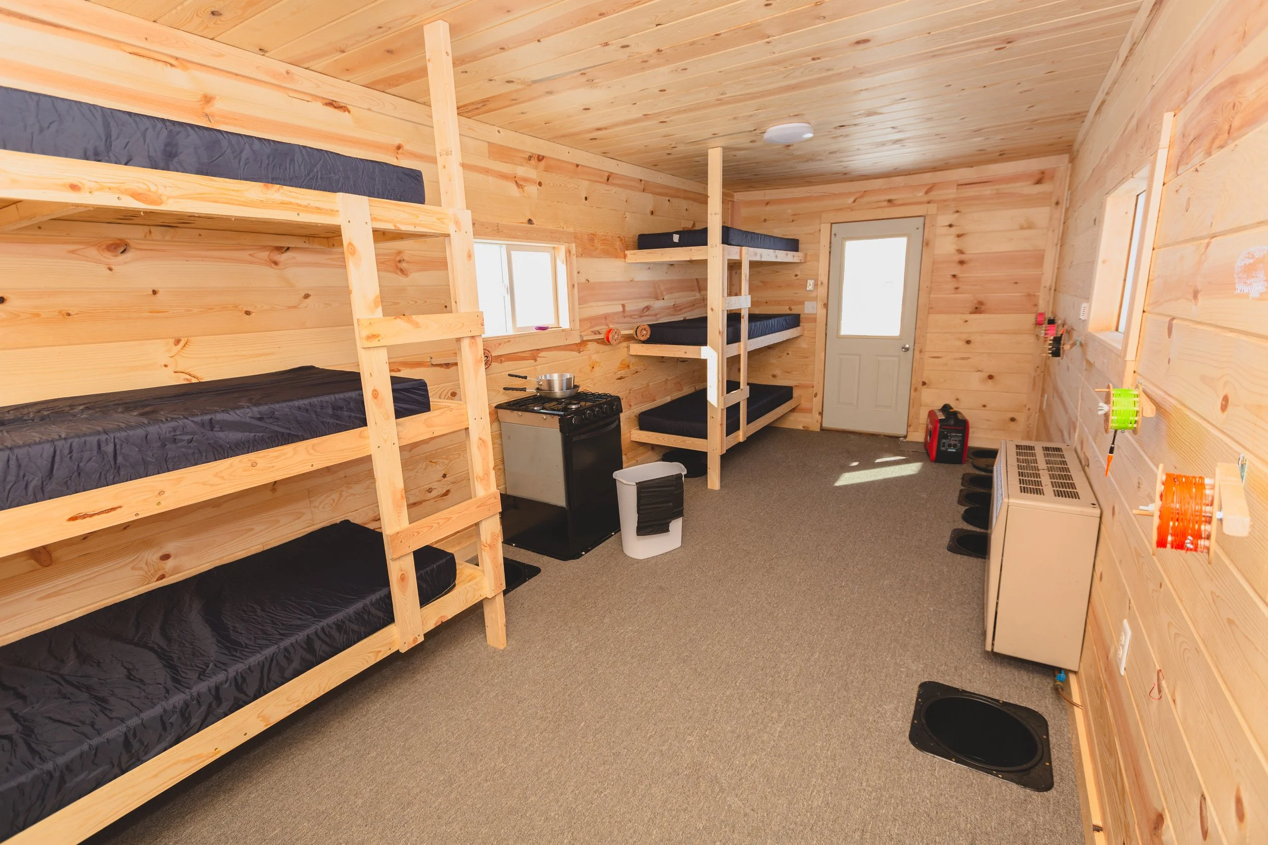Our 10’x22′ skid houses accommodate up to 6-individuals with two sets of three-stack bunk beds and have 10 holes and 10 rattle reels. The houses feature pine tongue and groove interiors, propane heat, electric lights and fan, a stove with an oven, and catch covers. A pizza pan, pot and skillet are provided along with a pizza cutter, spatula and serving spoon. Porta potties are available on the ice. A generator with extra premium gasoline is provided.